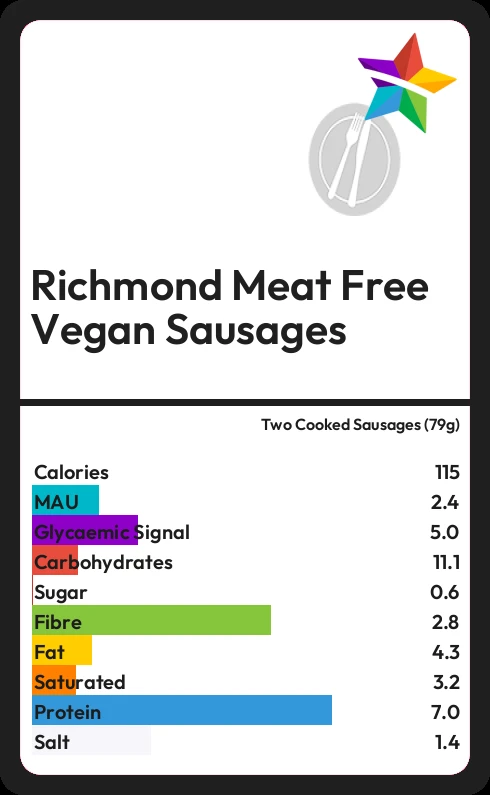 Richmond Meat Free Vegan Sausages contains 0.6g sugar in two Cooked Sausages (79g)