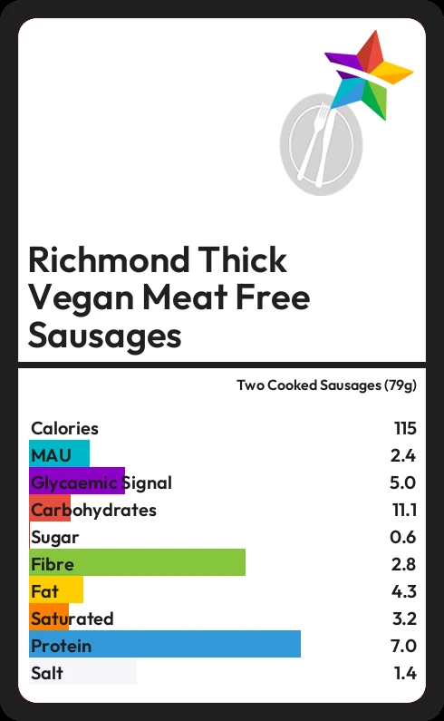 Richmond Thick Vegan Meat Free Sausages contains 0.6g sugar in two Cooked Sausages (79g)