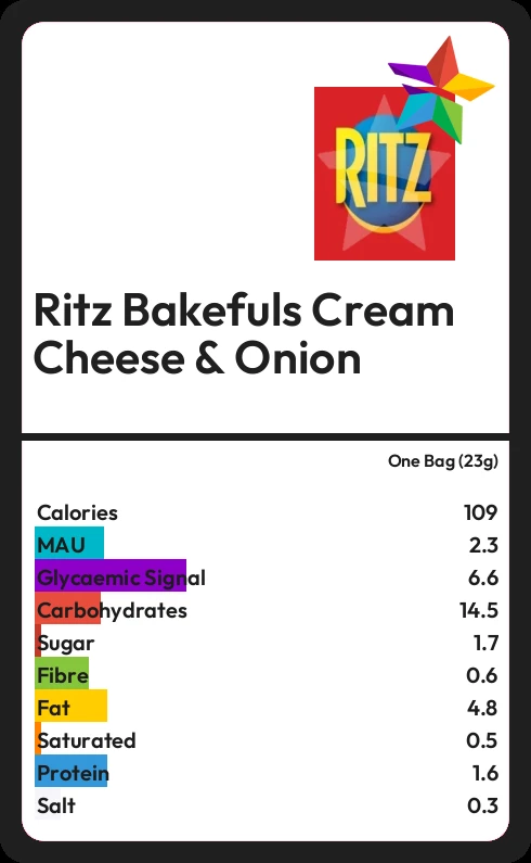 Ritz Bakefuls Cream Cheese & Onion contains 1.7g sugar in one Bag (23g)