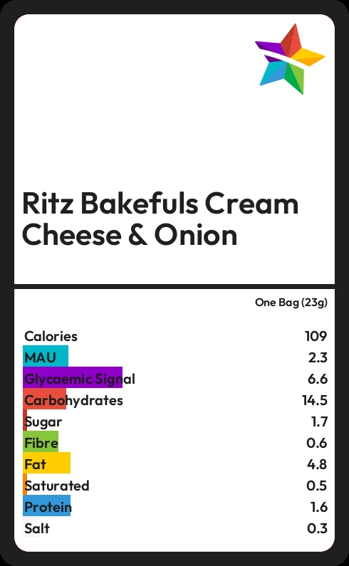 Ritz Bakefuls Cream Cheese & Onion contains 1.7g sugar in one Bag (23g)
