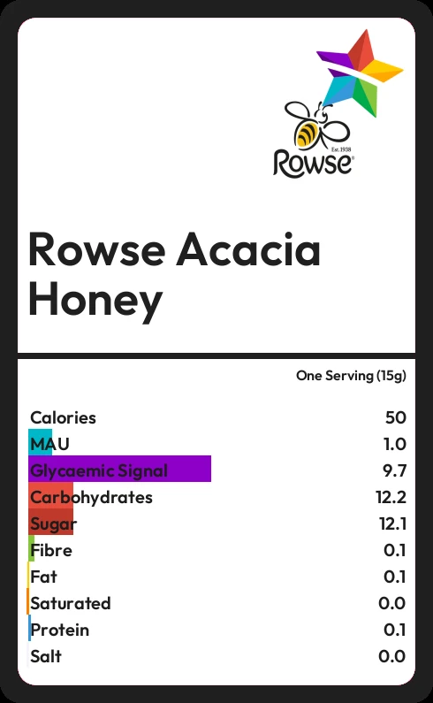 Rowse Acacia Honey contains 12.1g sugar in one Serving (15g) - that is around 3 cubes of sugar.