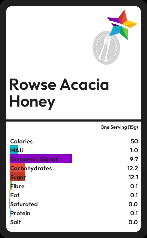 Rowse Acacia Honey contains 12.1g sugar in one Serving (15g) - that is around 3 cubes of sugar.