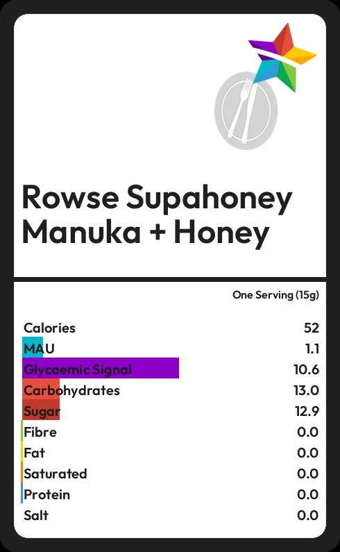 Rowse Supahoney Manuka + Honey contains 12.9g sugar in one Serving (15g) - that is around 3 cubes of sugar.