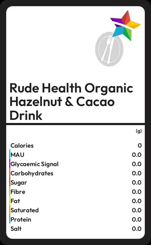 Rude Health Organic Hazelnut & Cacao Drink contains 57 calories in 100g.