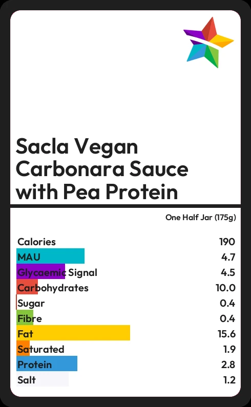 Sacla Vegan Carbonara Sauce with Pea Protein contains 190.8 calories in one Half Jar (175g).
