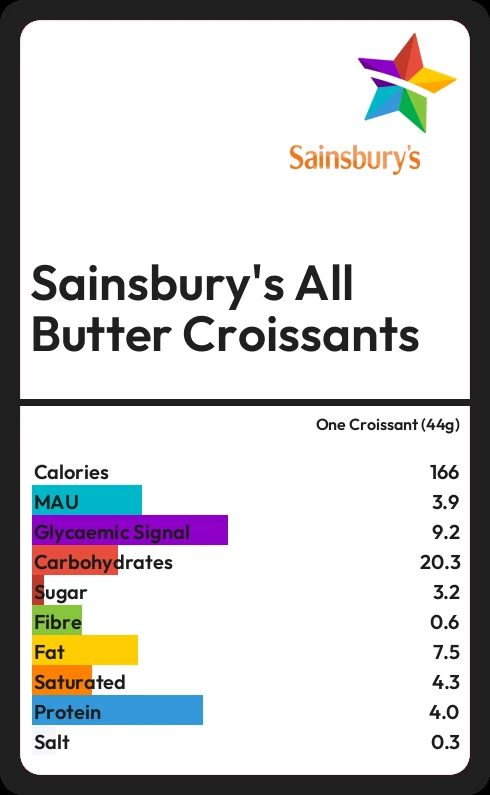 Sainsbury's All Butter Croissants contains 165.9 calories in one Croissant (44g).