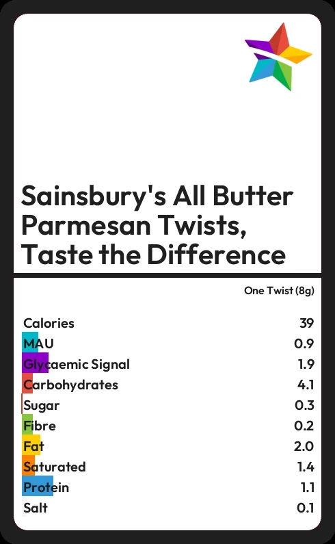 Sainsbury's All Butter Parmesan Twists, Taste the Difference contains 39.4 calories in one Twist (8g).