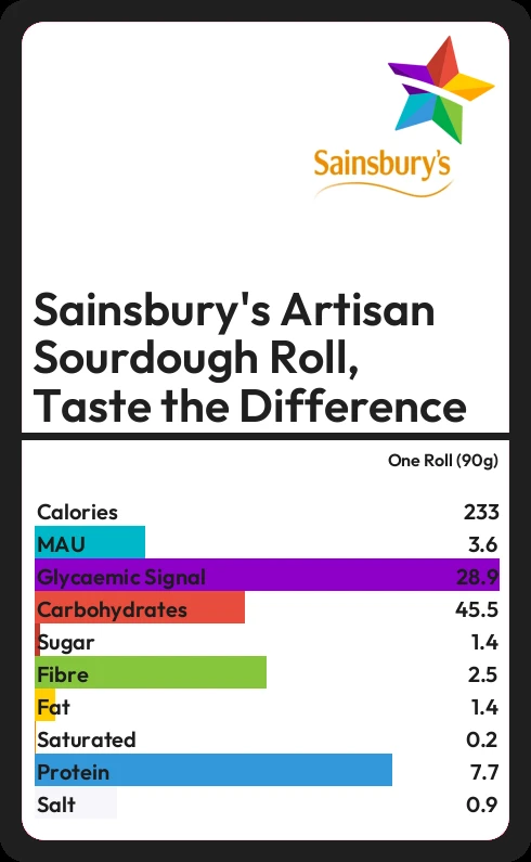 Sainsbury's Artisan Sourdough Roll, Taste the Difference contains 1.4g sugar in one Roll (90g)