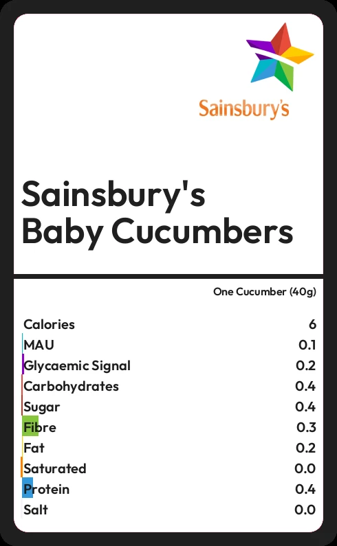 Sainsbury's Baby Cucumbers contains 0.4g sugar in one Cucumber (40g)