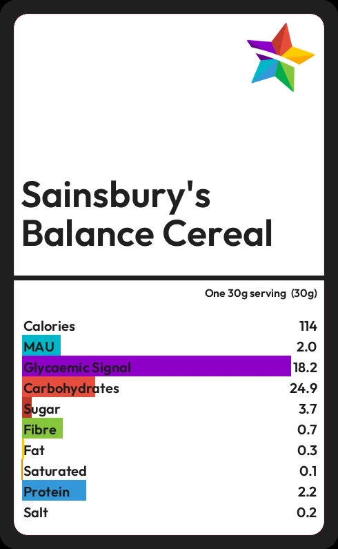 Sainsbury's Balance Cereal contains 114 calories in one 30g serving  (30g).