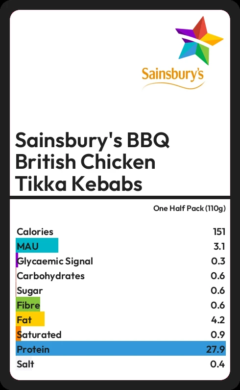 Sainsbury's BBQ British Chicken Tikka Kebabs contains 0.6g sugar in one Half Pack (110g)