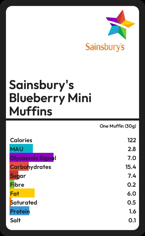 Sainsbury's Blueberry Mini Muffins contains 122.4 calories in one Muffin (30g).