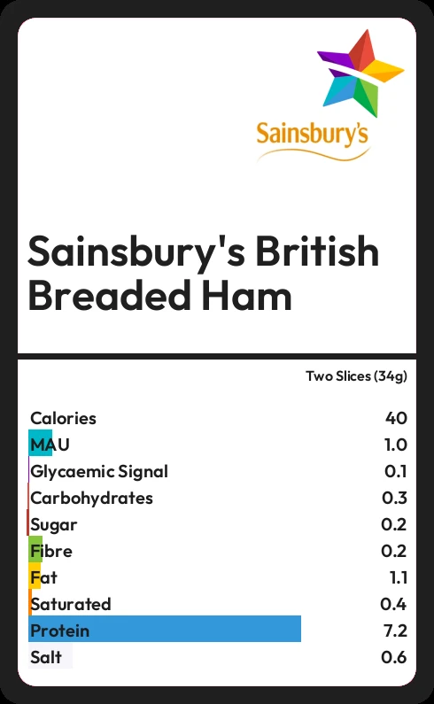 Sainsbury's British Breaded Ham contains 0.2g sugar in two Slices (34g)