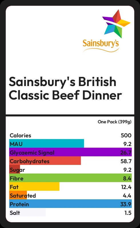 Sainsbury's British Classic Beef Dinner contains 9.2g sugar in one Pack (399g) - that is around 2 cubes of sugar.