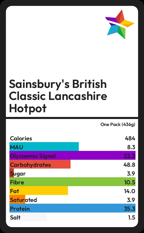 Sainsbury's British Classic Lancashire Hotpot contains 484 calories in one Pack (436g).