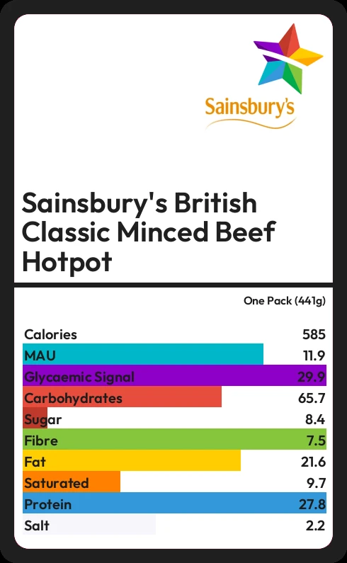 Sainsbury's British Classic Minced Beef Hotpot contains 586.5 calories in one Pack (441g).
