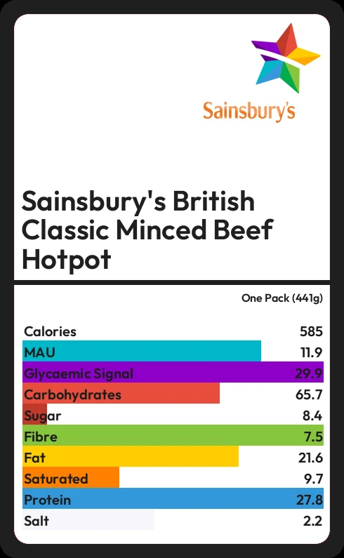 Sainsbury's British Classic Minced Beef Hotpot contains 586.5 calories in one Pack (441g).