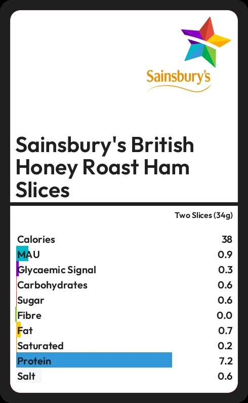 Sainsbury's British Honey Roast Ham Slices contains 38.1 calories in two Slices (34g).