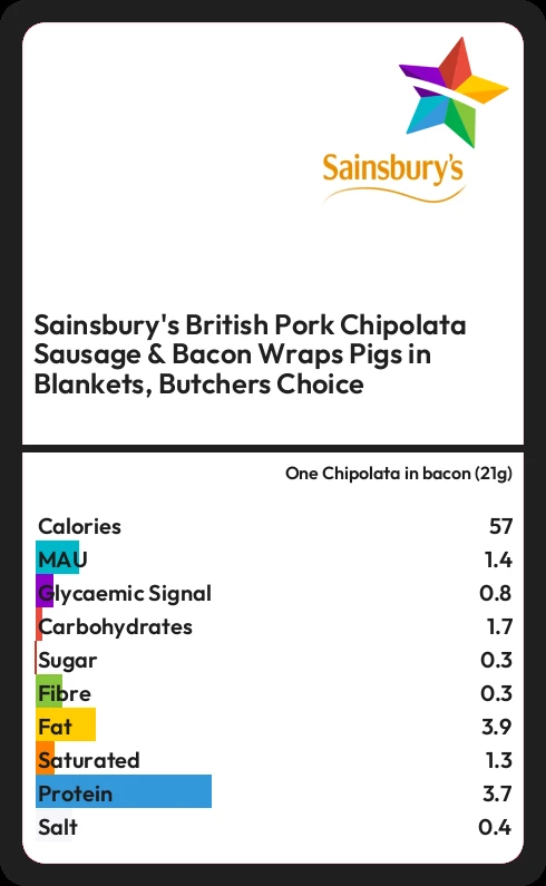 Sainsbury's British Pork Chipolata Sausage & Bacon Wraps Pigs in Blankets, Butchers Choice contains 0.3g sugar in one Chipolata in bacon (21g)