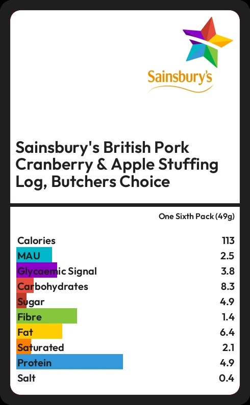 Sainsbury's British Pork Cranberry & Apple Stuffing Log, Butchers Choice contains 4.9g sugar in one Sixth Pack (49g) - that is around 1 cube of sugar.