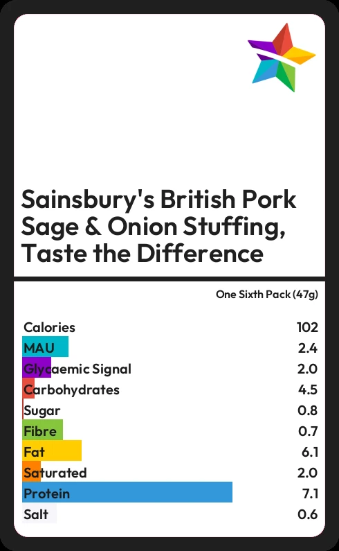 Sainsbury's British Pork Sage & Onion Stuffing, Taste the Difference contains 102 calories in one Sixth Pack (47g).