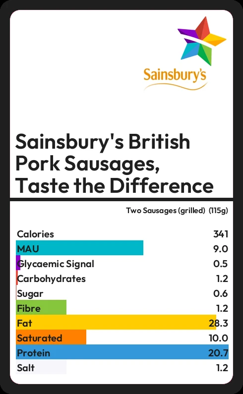 Sainsbury's British Pork Sausages, Taste the Difference contains 340.4 calories in two Sausages (grilled)  (115g).