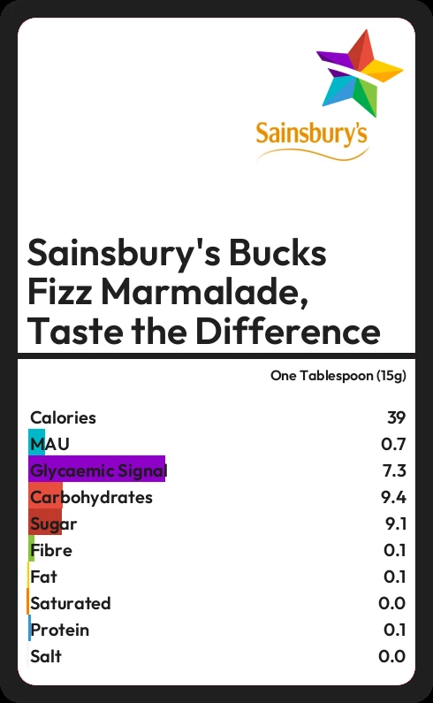 Sainsbury's Bucks Fizz Marmalade, Taste the Difference contains 39.3 calories in one Tablespoon (15g).