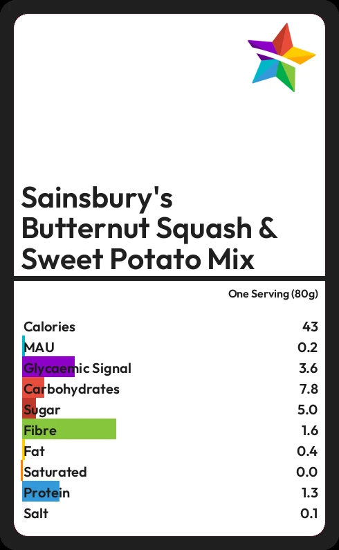 Sainsbury's Butternut Squash & Sweet Potato Mix contains 43.2 calories in one Serving (80g).