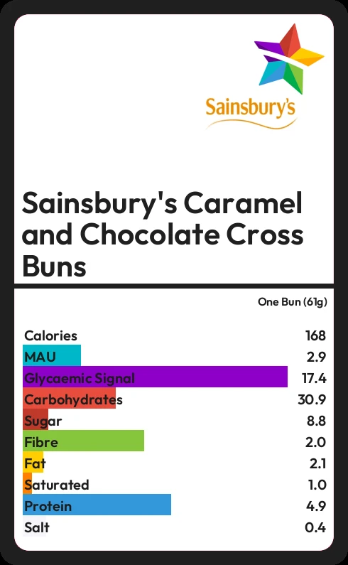 Sainsbury's Caramel and Chocolate Cross Buns contains 167.8 calories in one Bun (61g).