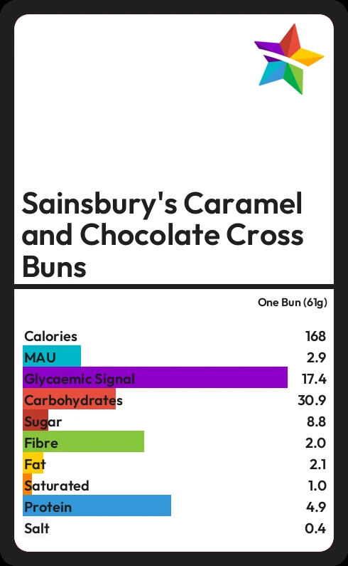 Sainsbury's Caramel and Chocolate Cross Buns contains 167.8 calories in one Bun (61g).