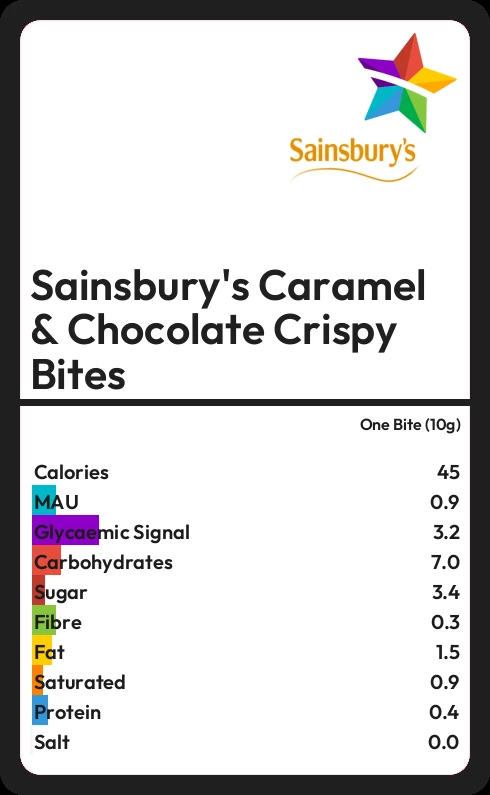 Sainsbury's Caramel & Chocolate Crispy Bites contains 3.4g sugar in one Bite (10g) - that is around 1 cube of sugar.