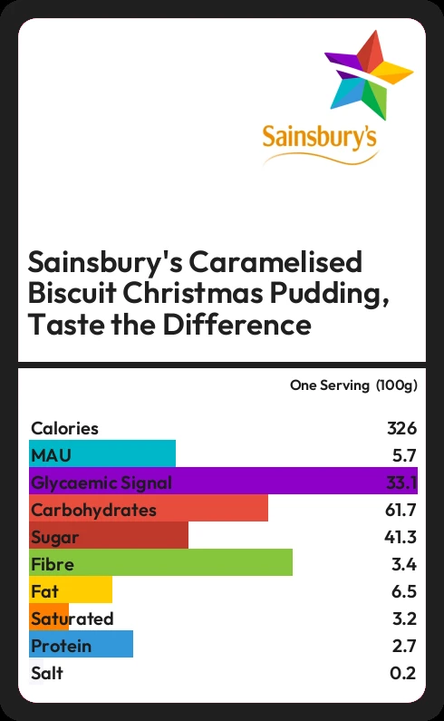 Sainsbury's Caramelised Biscuit Christmas Pudding, Taste the Difference contains 41.3g sugar in one Serving (100g) - that is around 10 cubes of sugar.