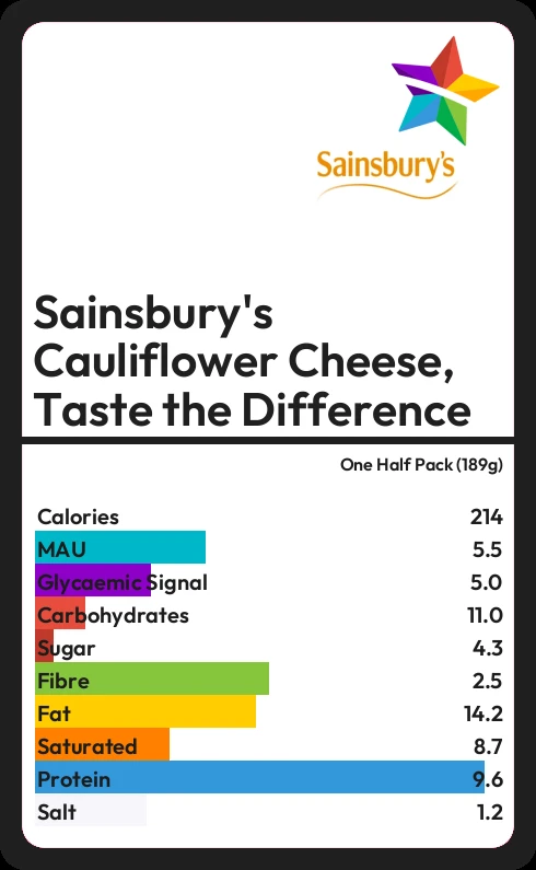 In one Half Pack (189g) of Sainsbury's Cauliflower Cheese, Taste the Difference there are 14.2g of fat of which 8.7g are saturated.