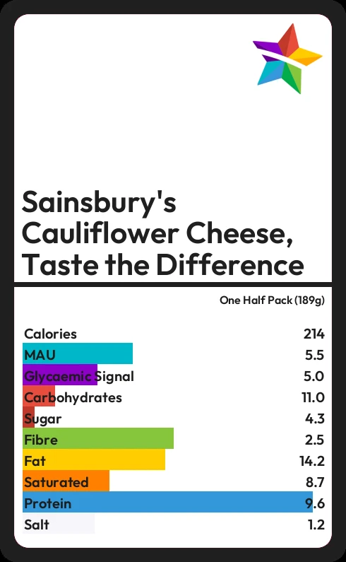 In one Half Pack (189g) of Sainsbury's Cauliflower Cheese, Taste the Difference there are 14.2g of fat of which 8.7g are saturated.