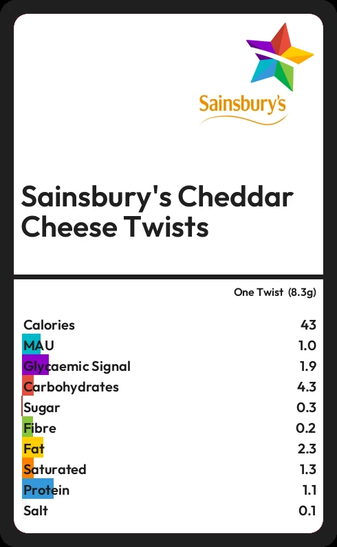 Sainsbury's Cheddar Cheese Twists contains 0.3g sugar in one Twist (8.3g)