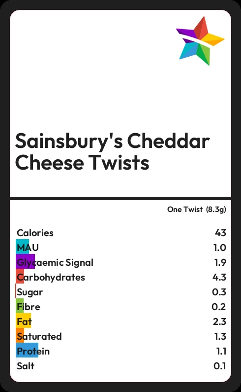Sainsbury's Cheddar Cheese Twists contains 0.3g sugar in one Twist (8.3g)