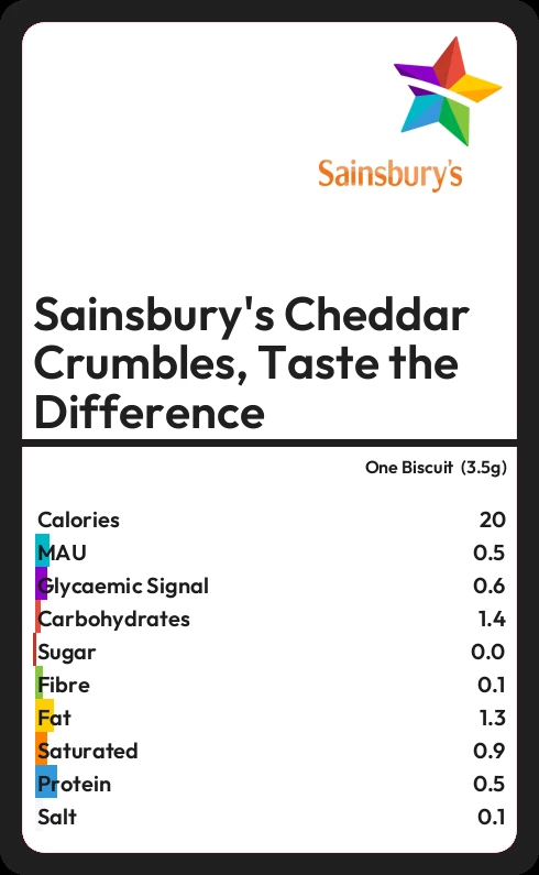 Sainsbury's Cheddar Crumbles, Taste the Difference contains 19.7 calories in one Biscuit (3.5g).