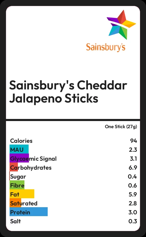 Sainsbury's Cheddar Jalapeno Sticks contains 0.4g sugar in one Stick (27g)