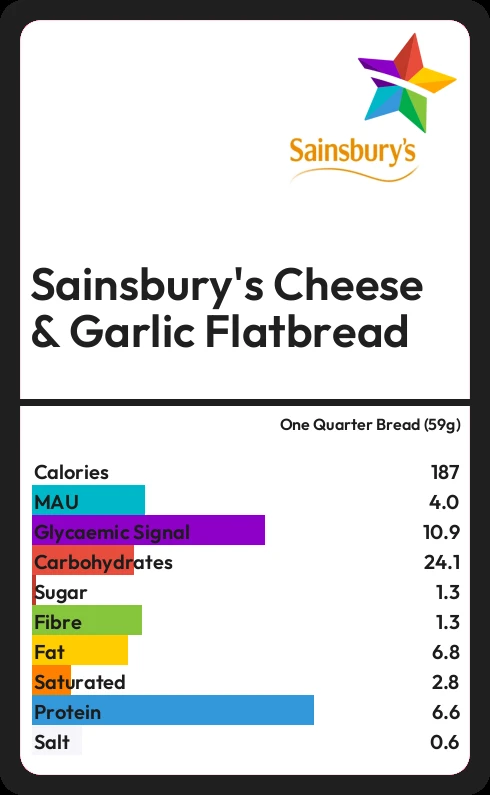 Sainsbury's Cheese & Garlic Flatbread contains 1.3g sugar in one Quarter Bread (59g)