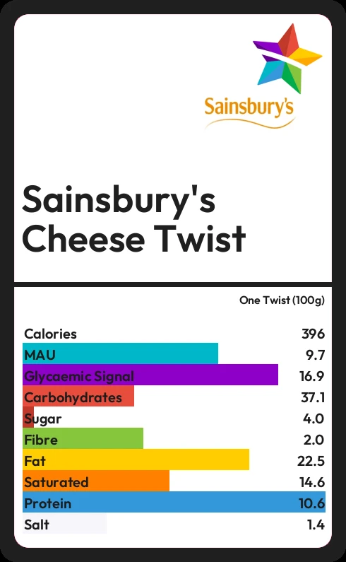 Sainsbury's Cheese Twist contains 396 calories in one Twist (100g).