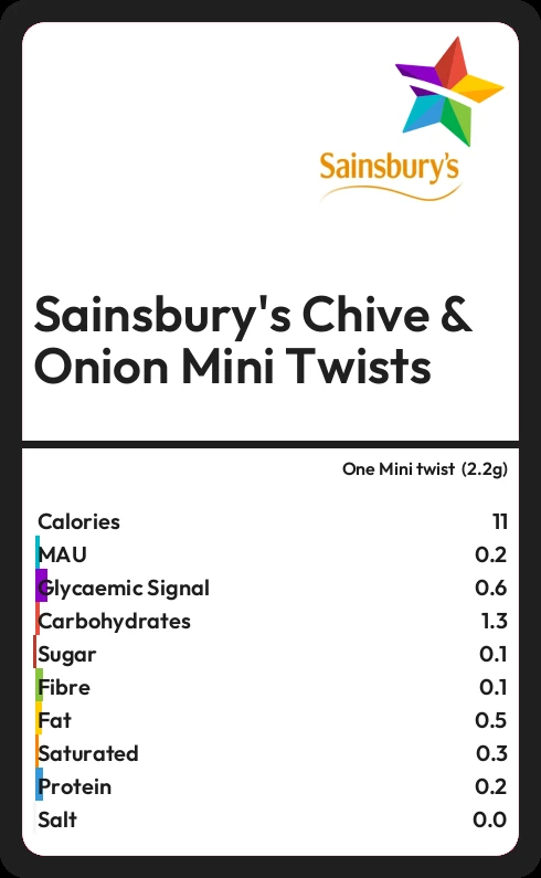 Sainsbury's Chive & Onion Mini Twists contains 0.1g sugar in one Mini twist (2.2g)