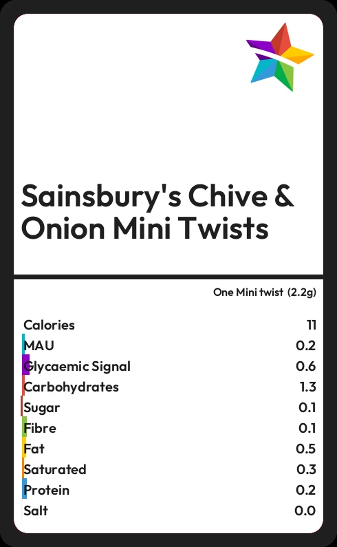 Sainsbury's Chive & Onion Mini Twists contains 0.1g sugar in one Mini twist (2.2g)