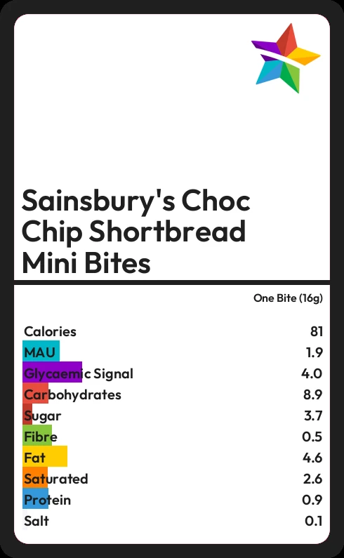 Sainsbury's Choc Chip Shortbread Mini Bites contains 81.4 calories in one Bite (16g).