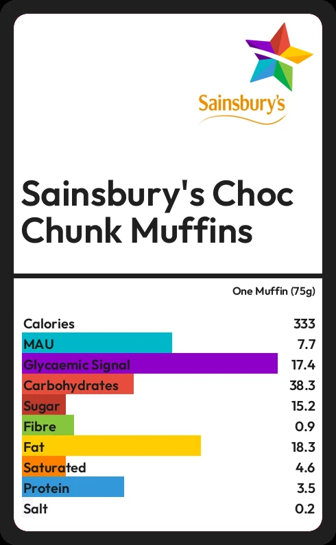 Sainsbury's Choc Chunk Muffins contains 333 calories in one Muffin (75g).
