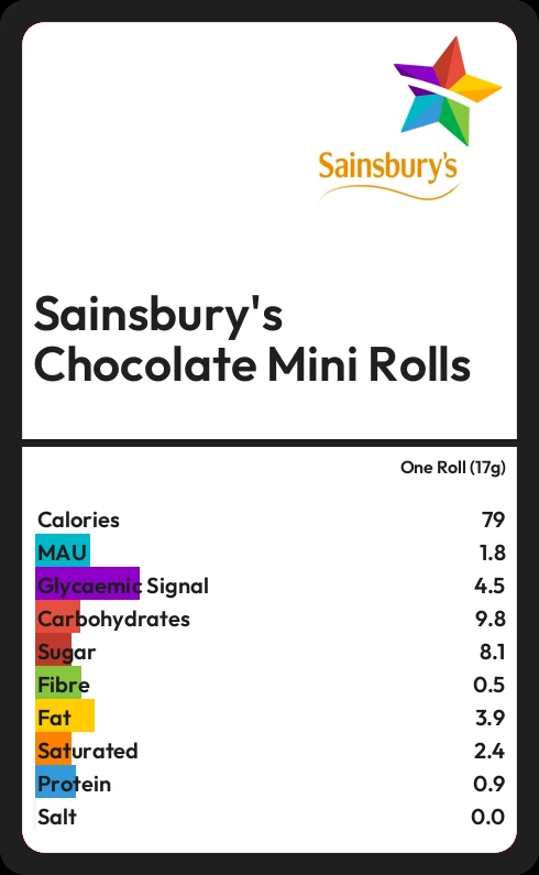Sainsbury's Chocolate Mini Rolls contains 8.1g sugar in one Roll (17g) - that is around 2 cubes of sugar.
