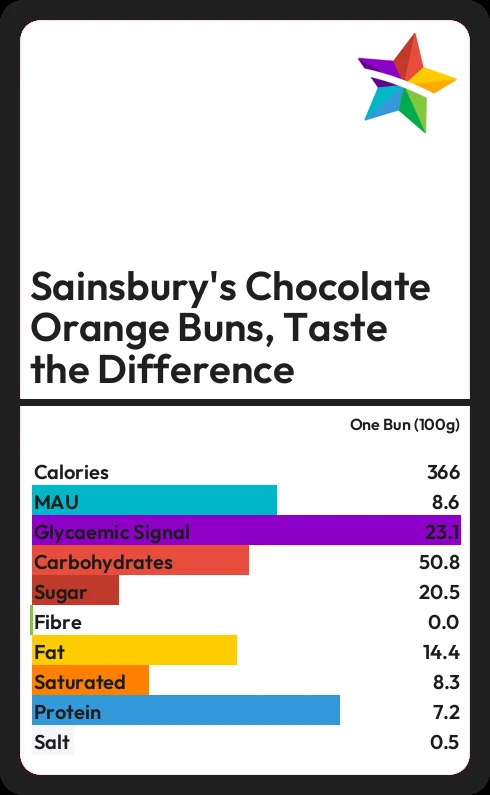 Sainsbury's Chocolate Orange Buns, Taste the Difference contains 20.5g sugar in one Bun (100g) - that is around 5 cubes of sugar.