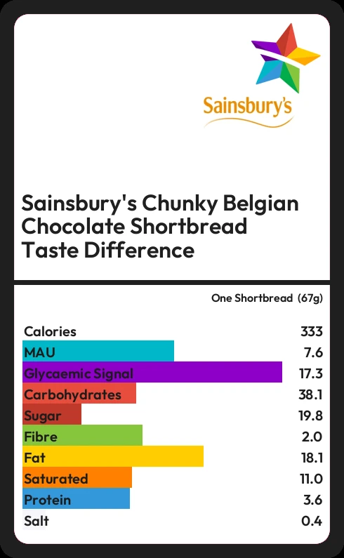 Sainsbury's Chunky Belgian Chocolate Shortbread Taste Difference contains 19.8g sugar in one Shortbread (67g) - that is around 5 cubes of sugar.