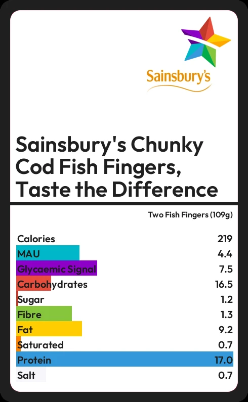 Sainsbury's Chunky Cod Fish Fingers, Taste the Difference contains 219.1 calories in two Fish Fingers (109g).