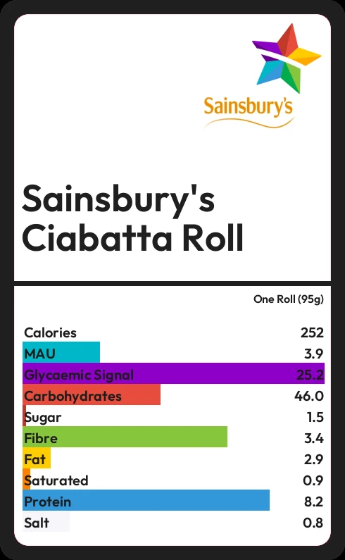 Sainsbury's Ciabatta Roll contains 1.5g sugar in one Roll (95g)