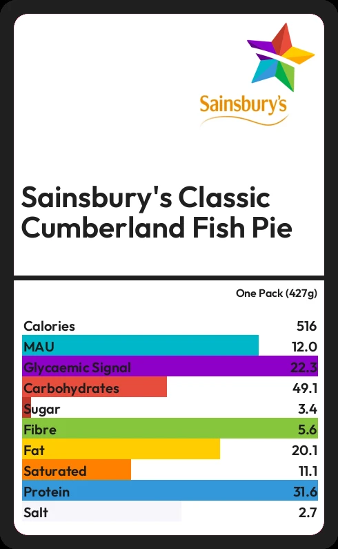 Sainsbury's Classic Cumberland Fish Pie contains 516.7 calories in one Pack (427g).